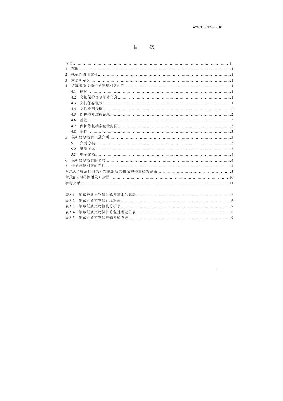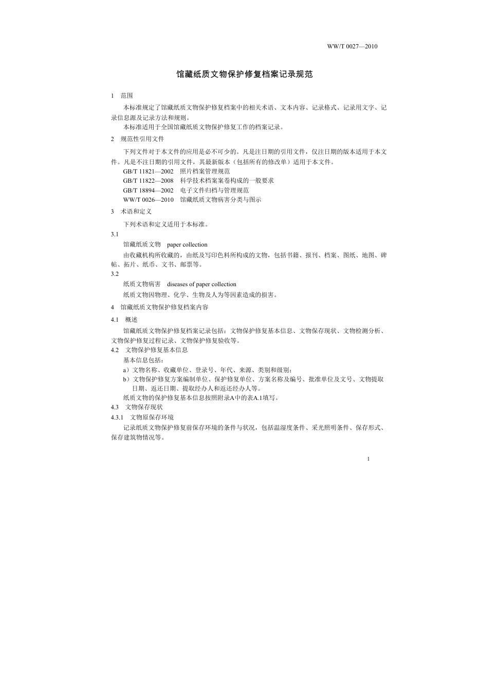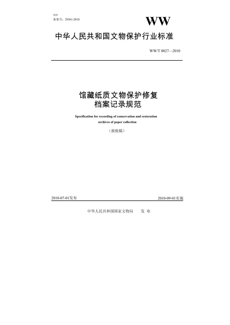 WW/T 0027-2010 馆藏纸质文物保护修复档案记录规范