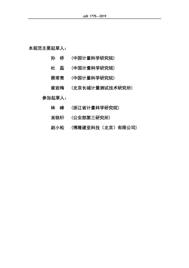 孙桥(中国计量科学研究院)、杜磊(中国计量科学研究院)、蔡常青(中国计量科学研究院)、崔岩梅(北京长城计量测试技术研究所)、林峰(浙江省计量科学研究院)、吴轶轩(公安部第三研究所)、赵小松(博隆建亚科技(北京)有限公司)