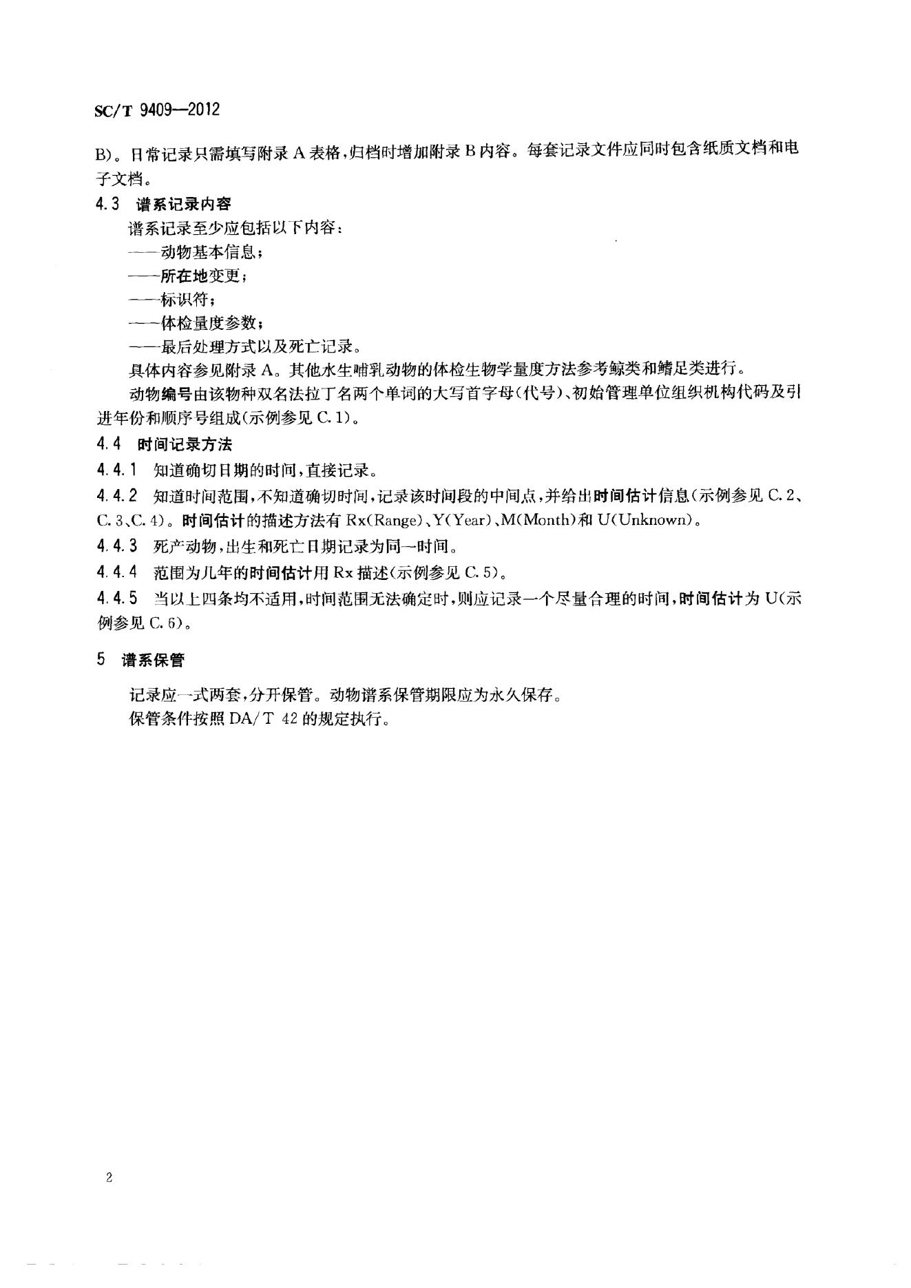 SC/T 9409-2012 水生哺乳动物谱系记录规范
