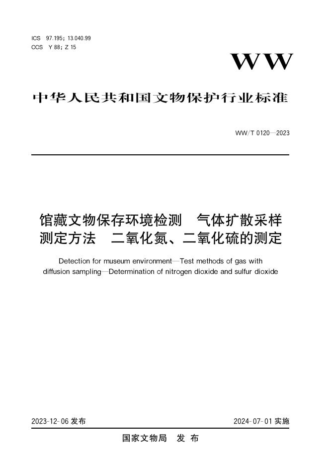 WW/T 0120-2023 馆藏文物保存环境检测 气体扩散采样测定方法 二氧化氮、二氧化硫的测定