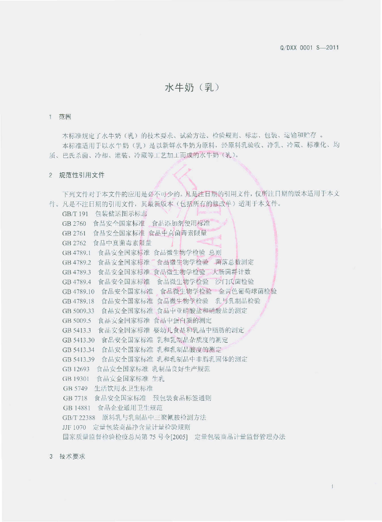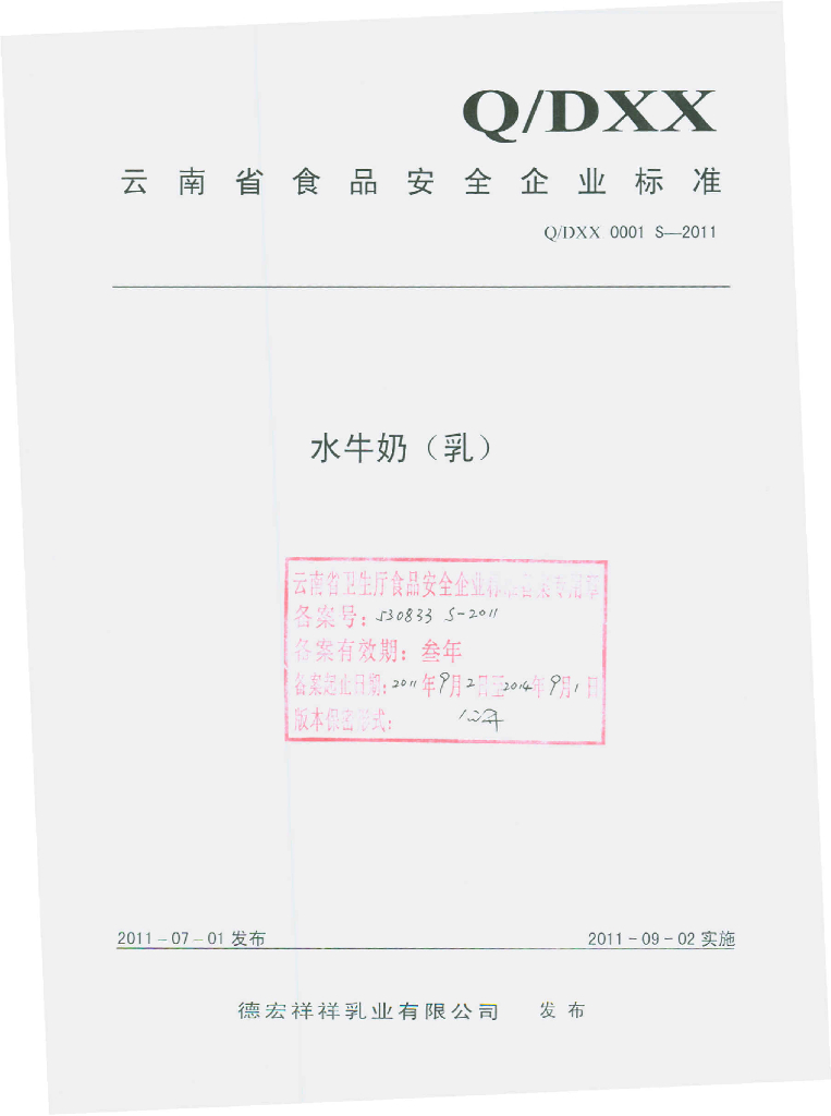 Q/DXX 0001S-2011 水牛奶(乳)