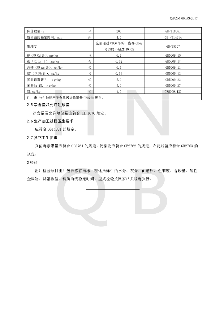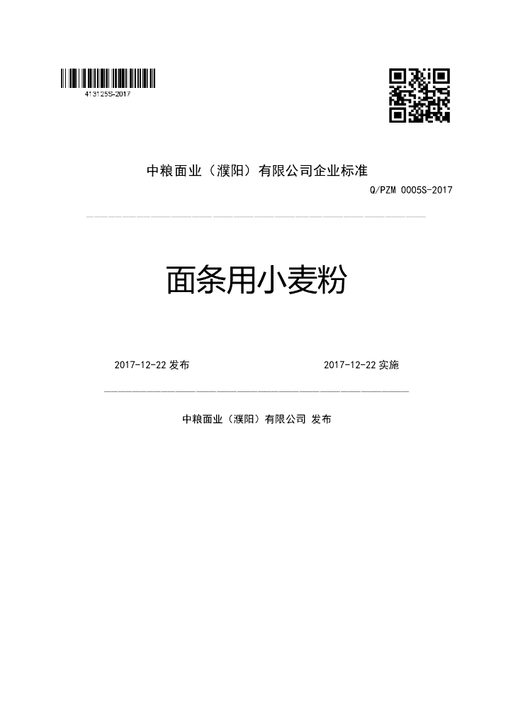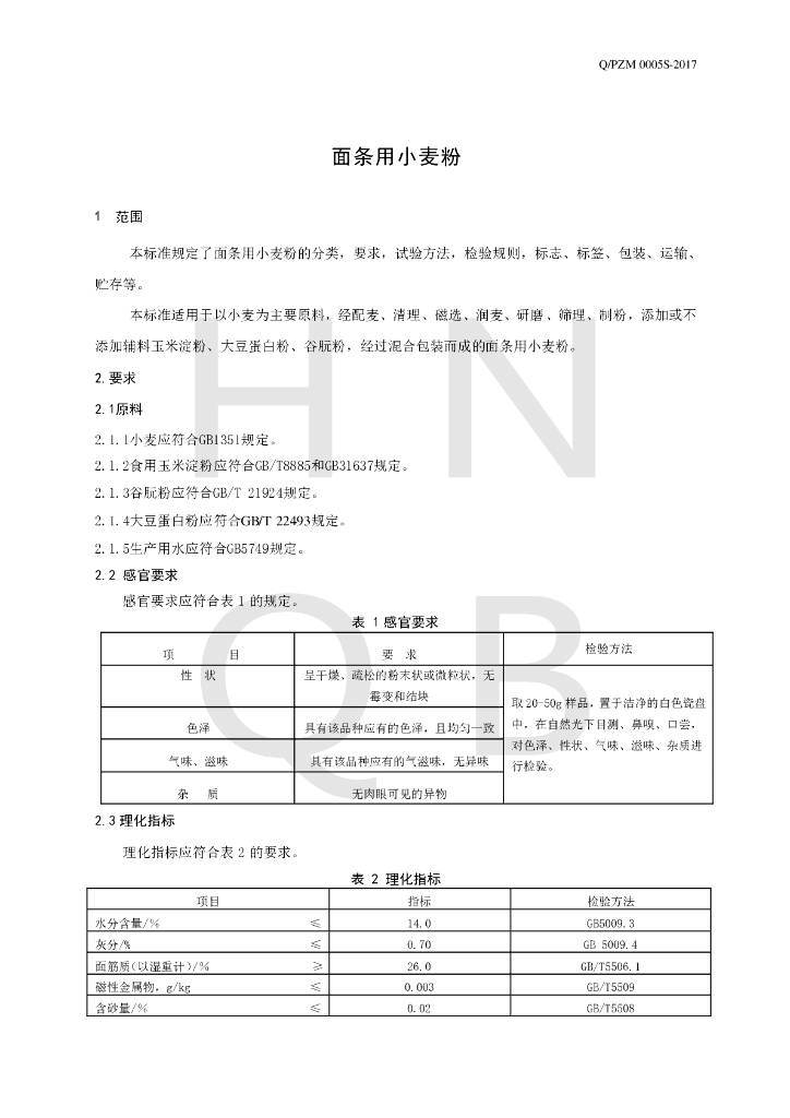 Q/PZM 0005S-2017 面条用小麦粉