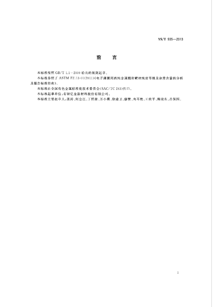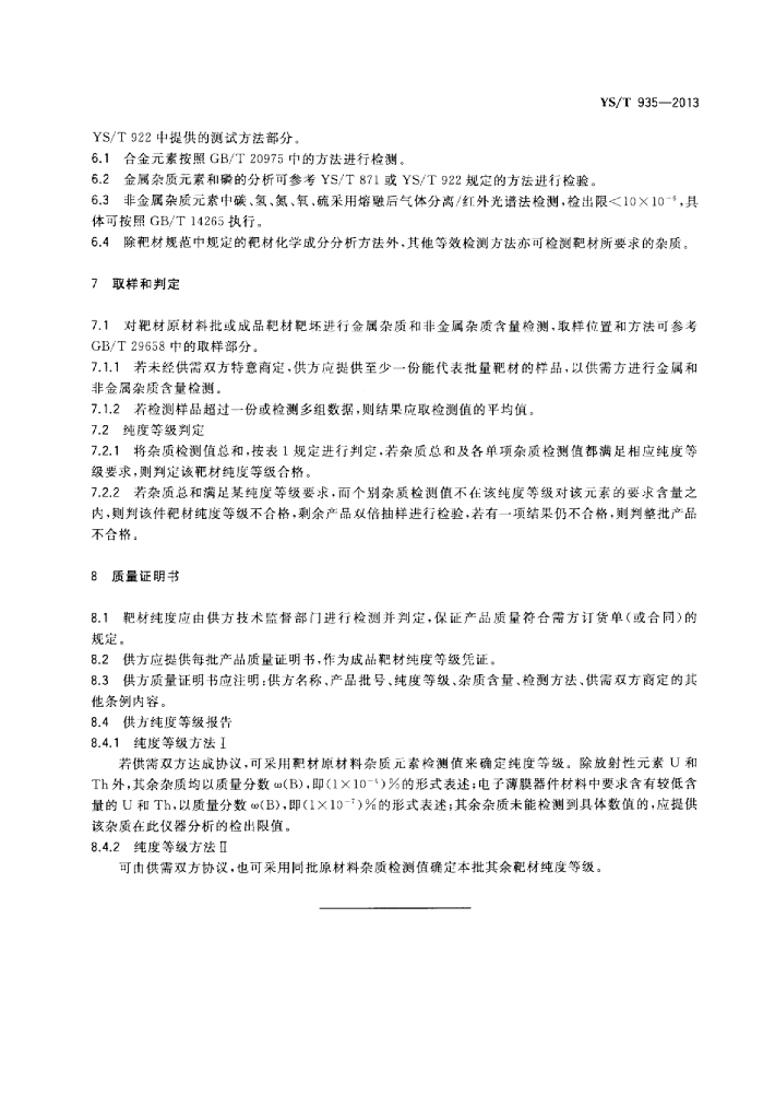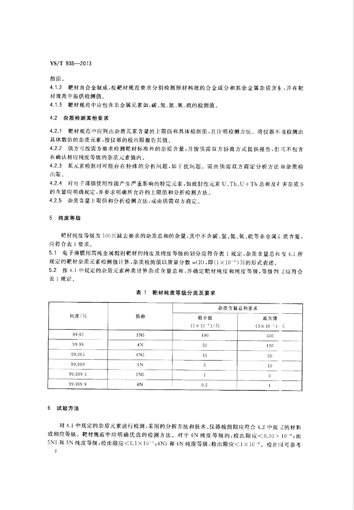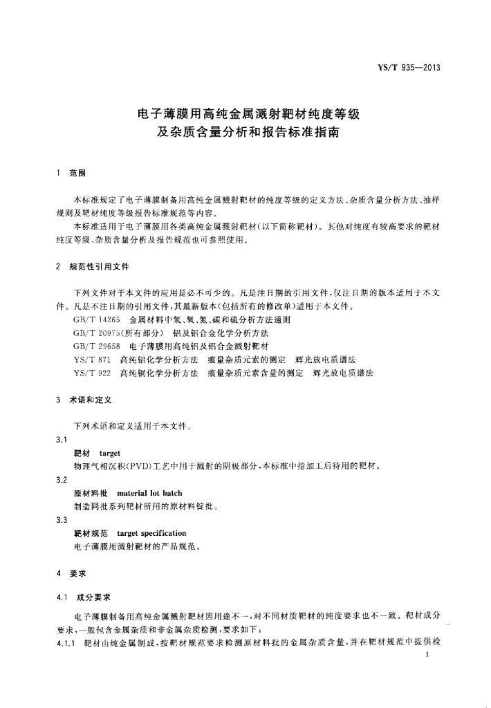 YS/T 935-2013 电子薄膜用高纯金属溅射靶材纯度等级及杂质含量分析和报告标准指南