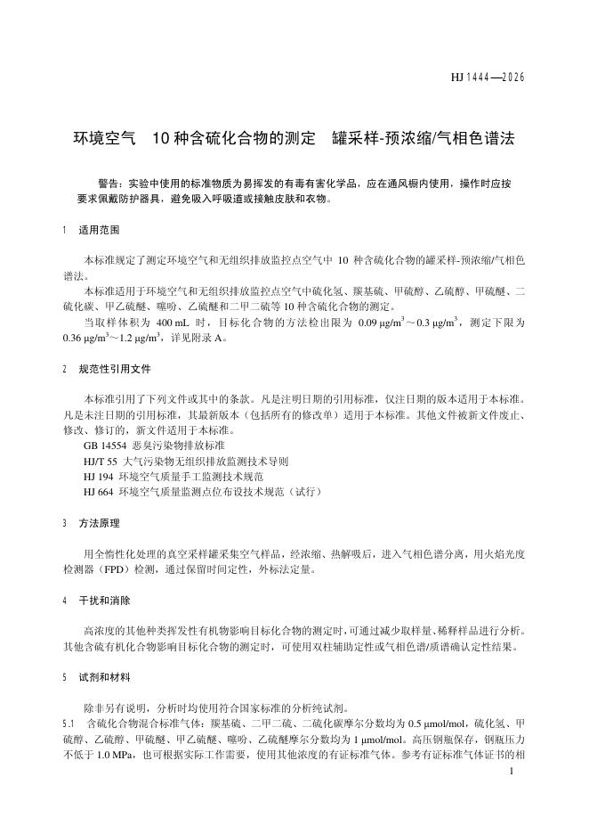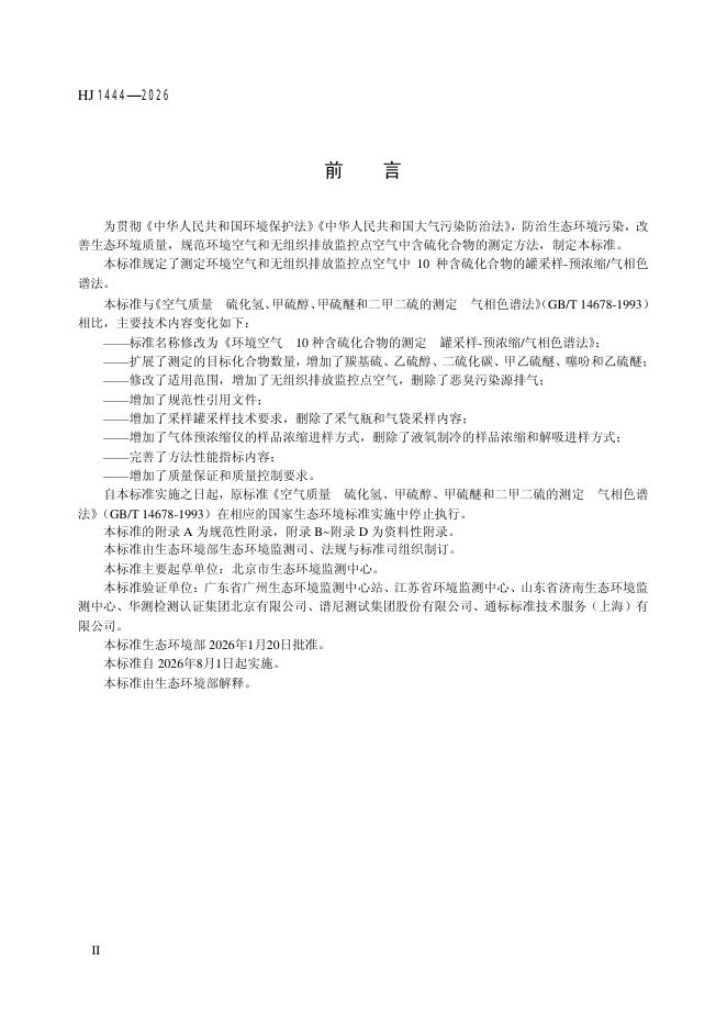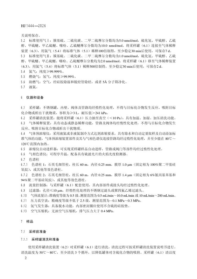 HJ 1444-2026 环境空气 10种含硫化合物的测定 罐采样-预浓缩 气相色谱法