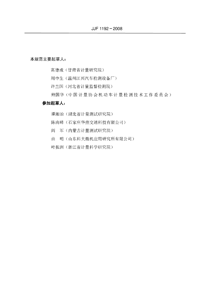 高德成(甘肃省计量研究院)、周申生(温州江兴汽车检测设备厂)、许兰国(河北省计量监督检测院)、鲍国华(中国计量协会机动车计量检测技术工作委员会)、谭湘治(湖北省计量测试研究院)、陈南峰(石家庄华燕交通科技有限公司)、阎军(内蒙古计量测试研究院)、曲明(山东科大微机应用研究有限公司)、叶振洲(浙江省计量科学研究院)