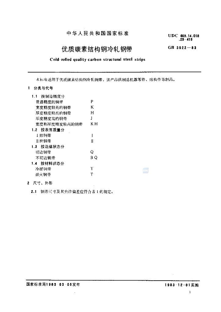 GB/T 3522-1983 优质碳素结构钢冷轧钢带