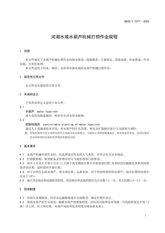 DB35/T 2271-2025 河湖水域水葫芦机械打捞作业规程