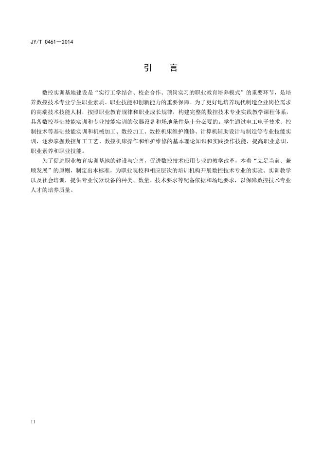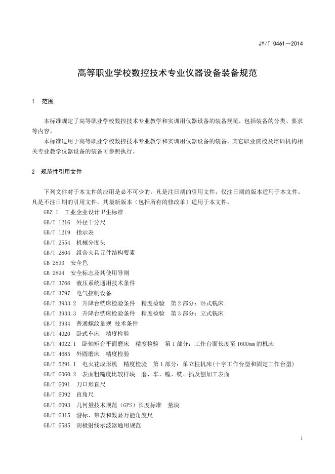 JY/T 0461-2014 高等职业学校数控技术专业仪器设备装备规范