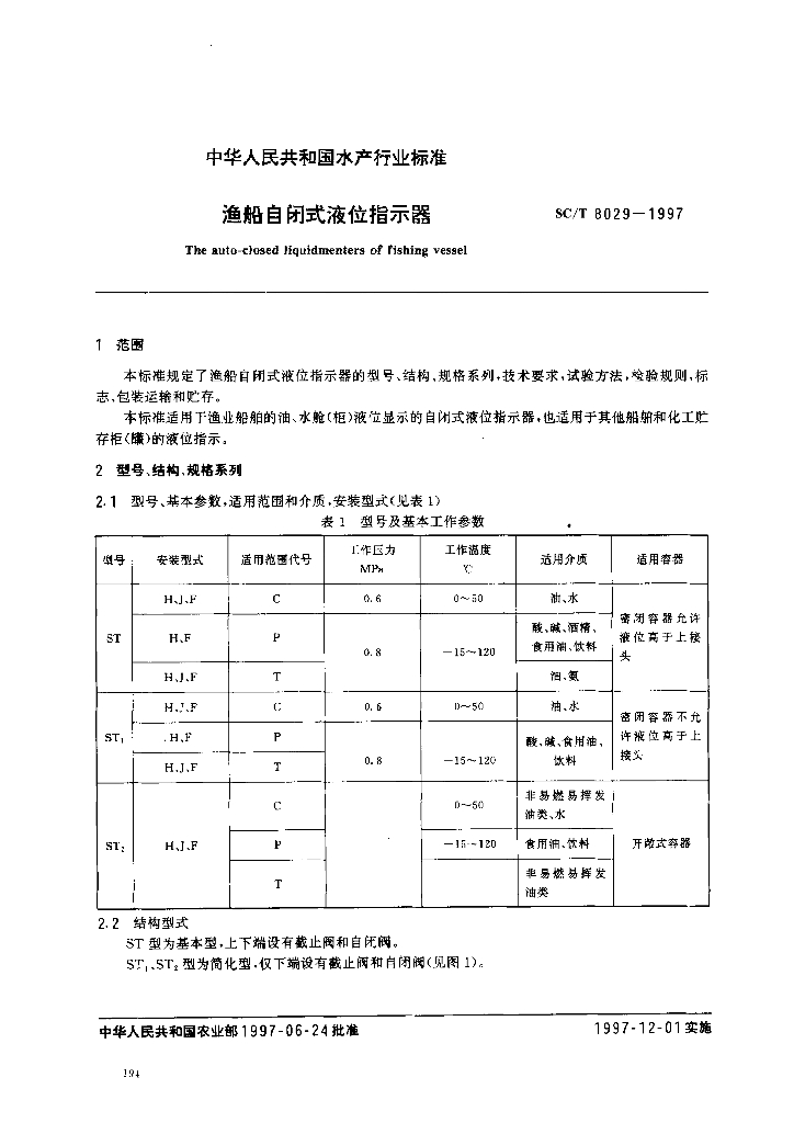 SC/T 8029-1997 渔船自闭式液位措示器