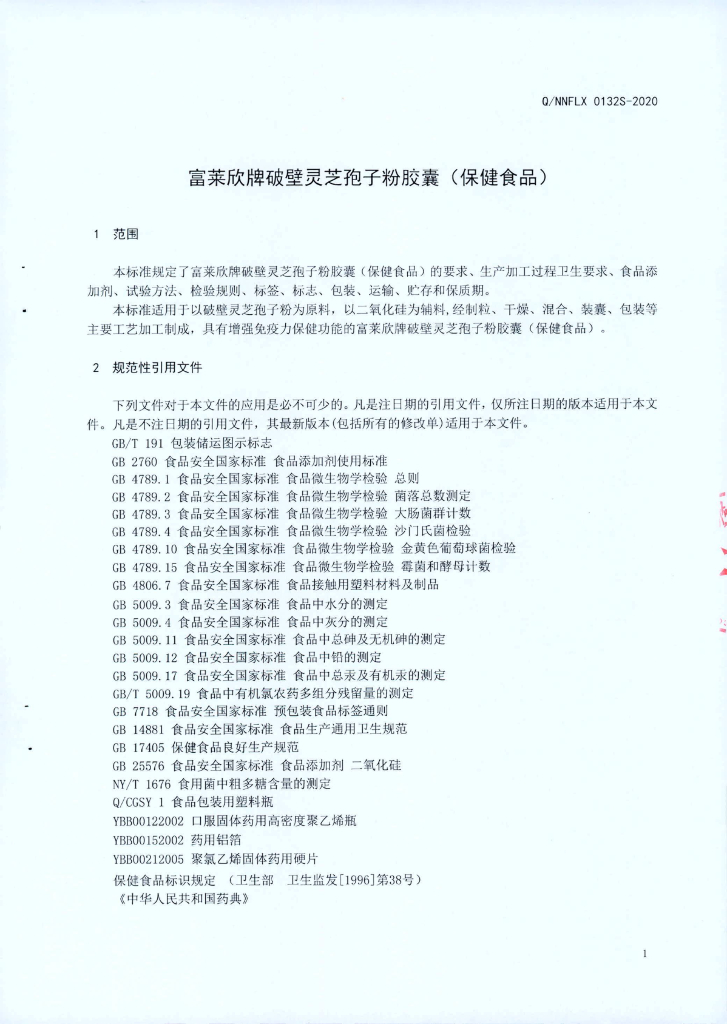 Q/NNFLX 0132S-2020 富莱欣牌破壁灵芝孢子粉胶囊(保健食品)