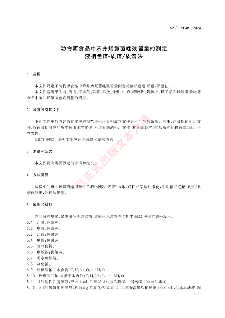 SN/T 5648-2024 动物源食品中苯并烯氟菌唑残留量的测定 液相色谱-质谱/质谱法