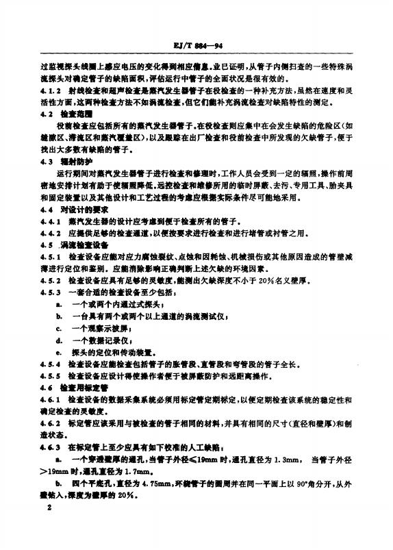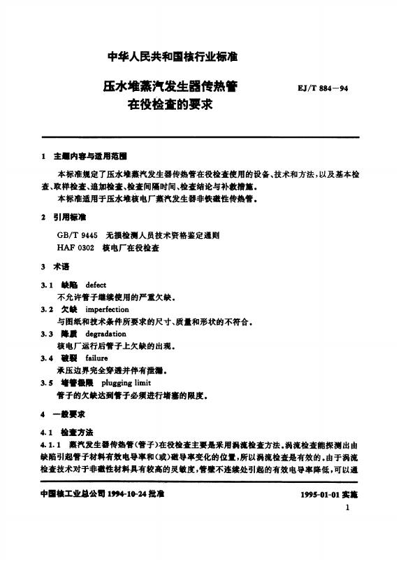 EJ/T 884-1994 压水堆蒸汽发生器传热管在役检查的要求