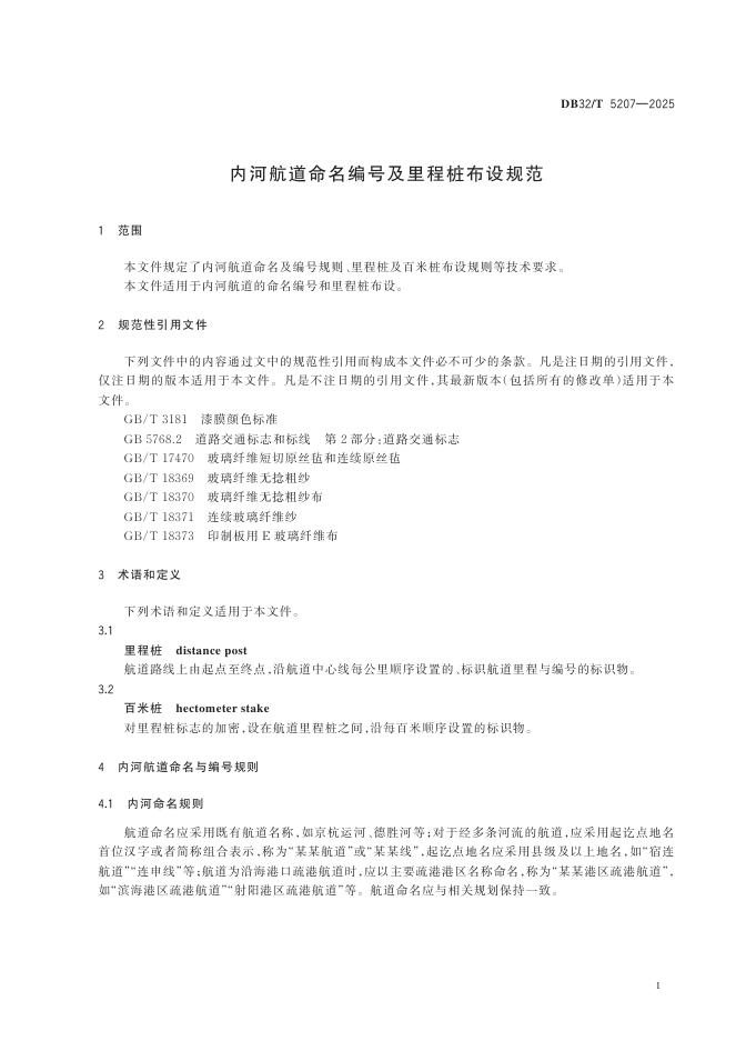 DB32/T 5207-2025 内河航道命名编号及里程桩布设规范