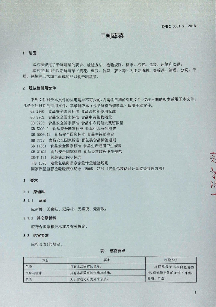 Q/BC 0001S-2018 干制蔬菜