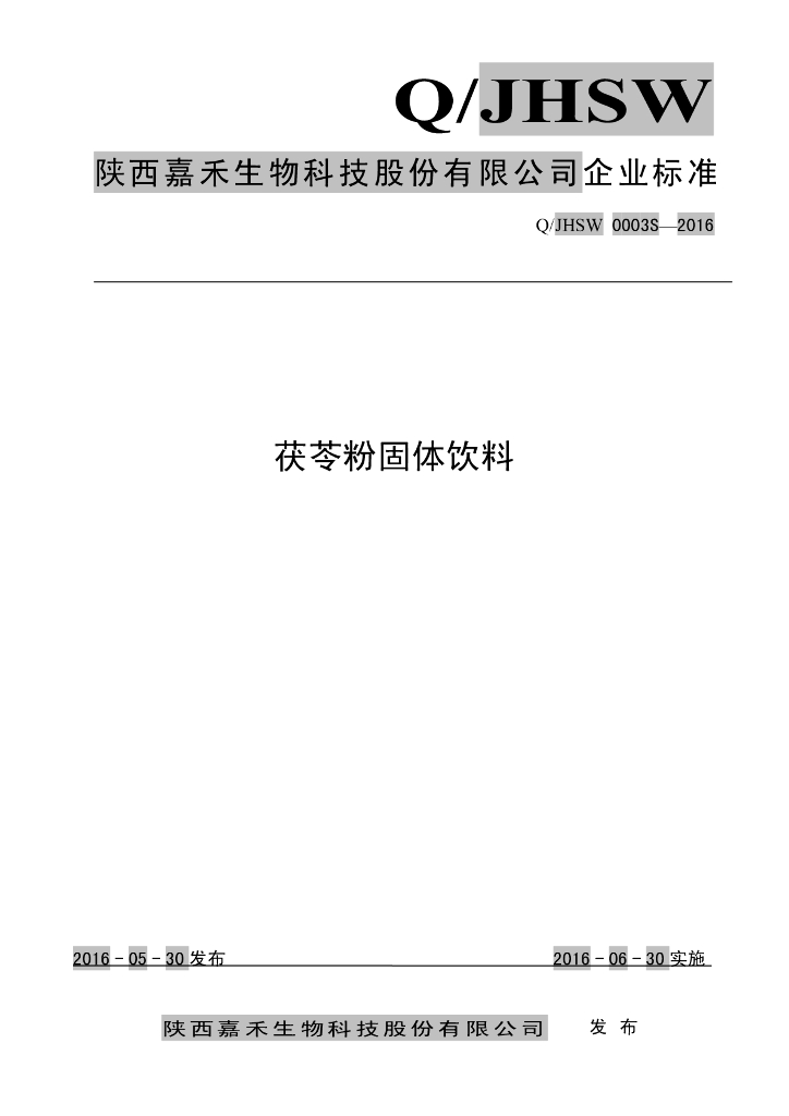Q/JHSW 0003S-2016 陕西嘉禾生物科技股份有限公司 茯苓粉固体饮料
