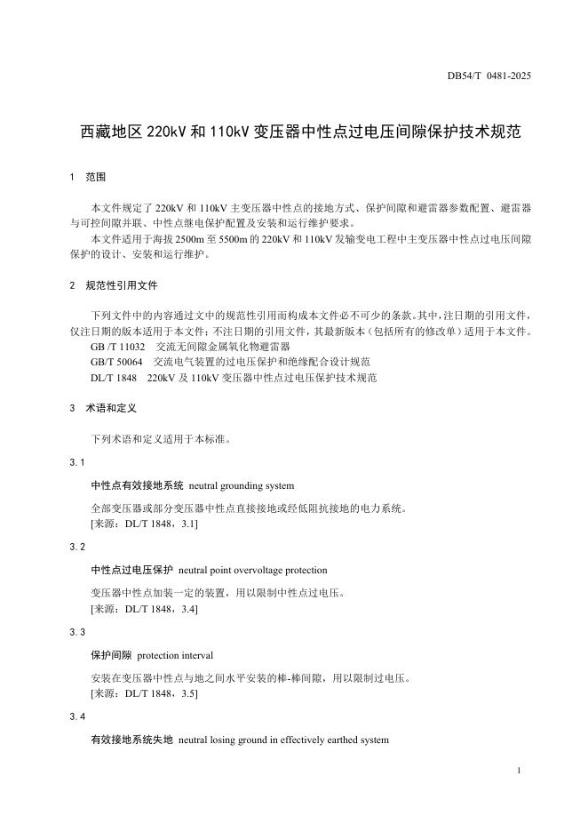 DB54/T 0481-2025 西藏地区220kV和110kV变压器中性点过电压间隙保护技术规范