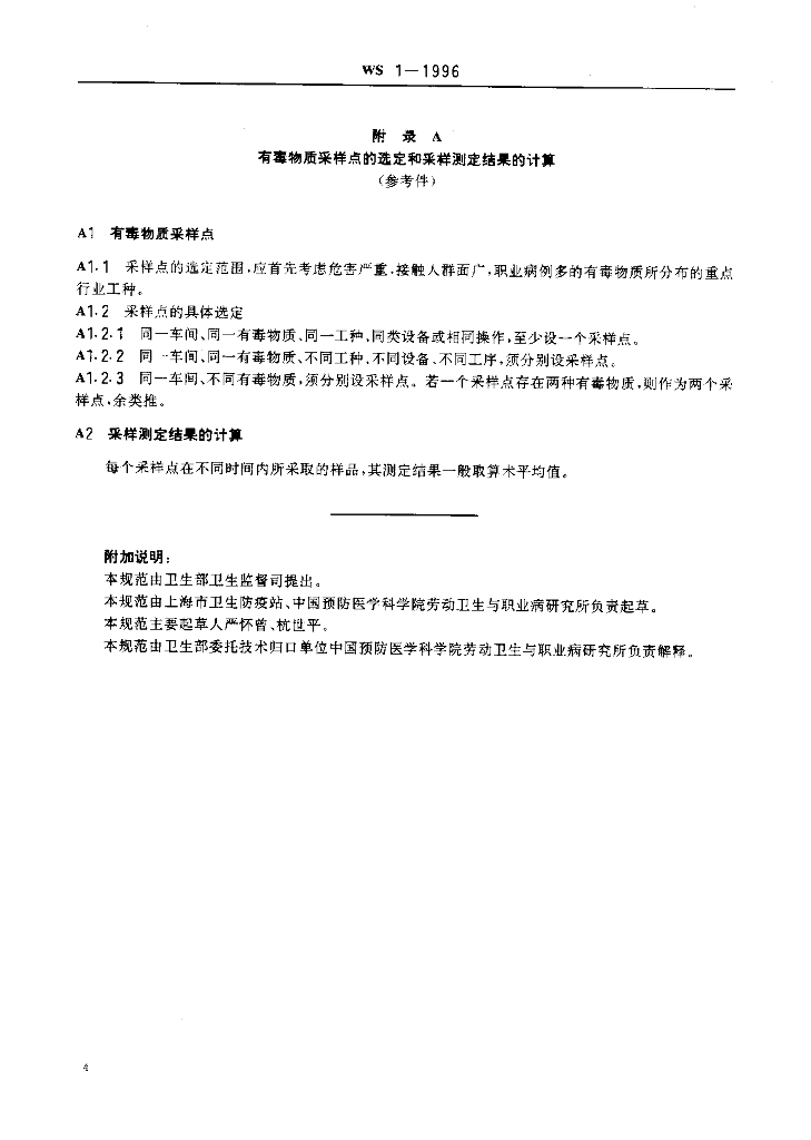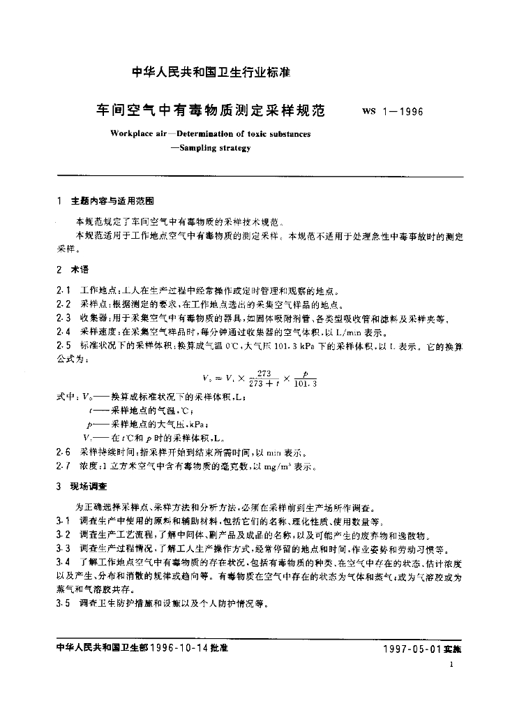 WS/T 1-1996 车间空气中有毒物质测定采样规范