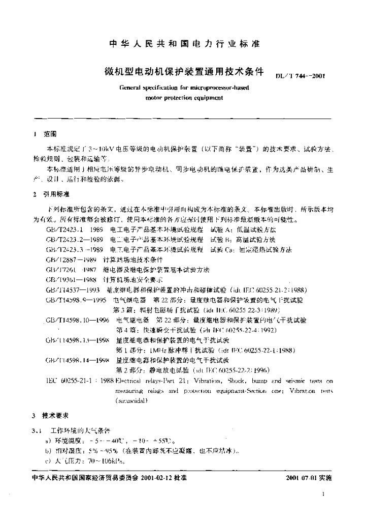 DL/T 744-2001 微机型电动机保护装置通用技术条件