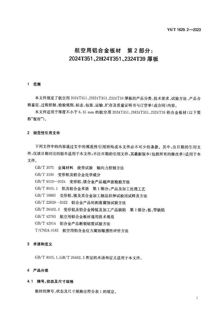 YS/T 1629.2-2023 航空用铝合金板材 第2部分:2024T351、2H24T351、2324T39厚板