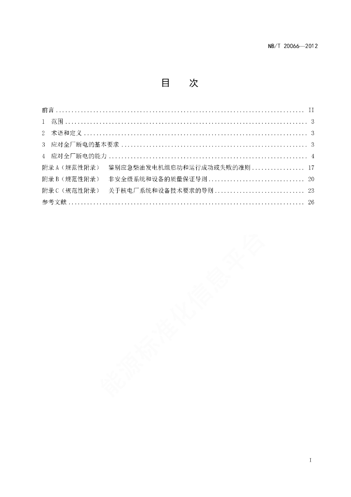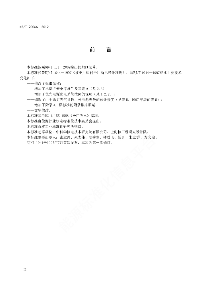 NB/T 20066-2012 核电厂应对全厂断电设计准则