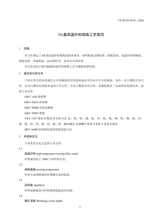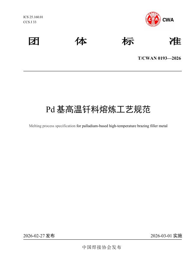 T/CWAN 0193-2026 Pd 基高温钎料熔炼工艺规范