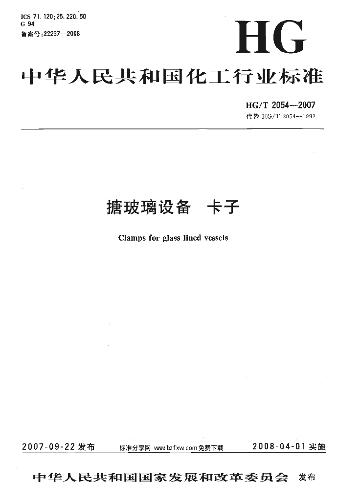 HG/T 2054-2007 代替 HG/T 2054-1991 搪玻璃设备 卡子