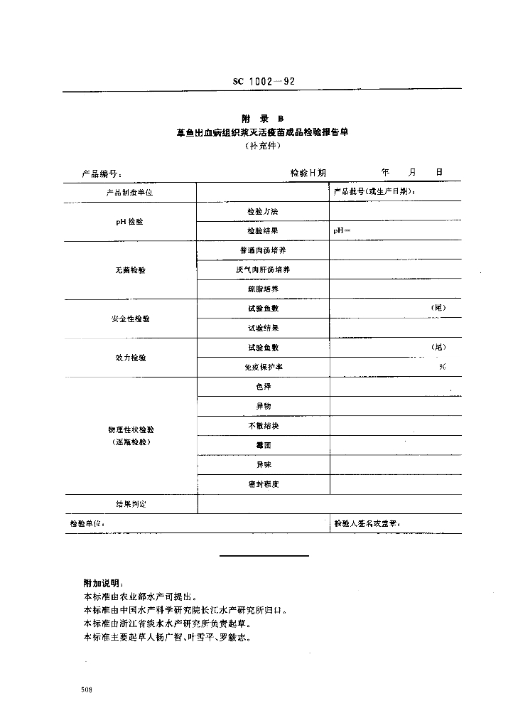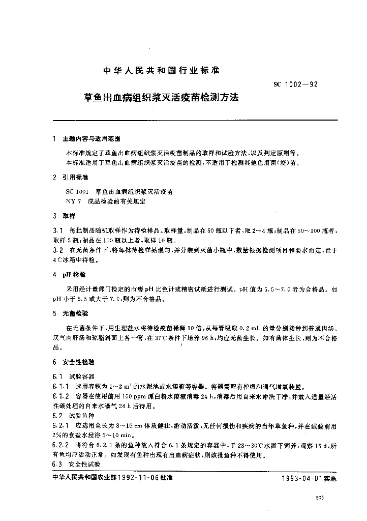 SC 1002-1992 草鱼出血病组织浆灭活疫苗检测方法