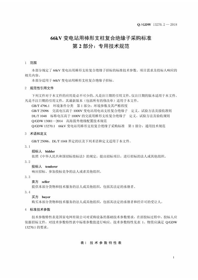 Q/GDW 13270.2-2018 66kV变电站用棒形支柱复合绝缘子采购标准 第2部分:专用技术规范