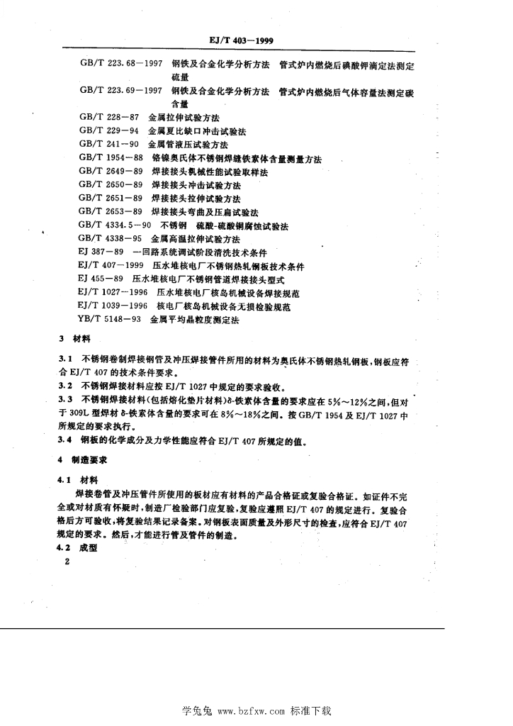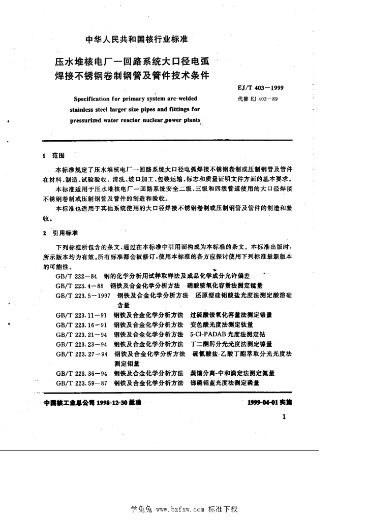 EJ/T 403-1999 压水堆核电厂—回路系统大口径电弧焊接不锈钢卷制钢管及管件技术条件