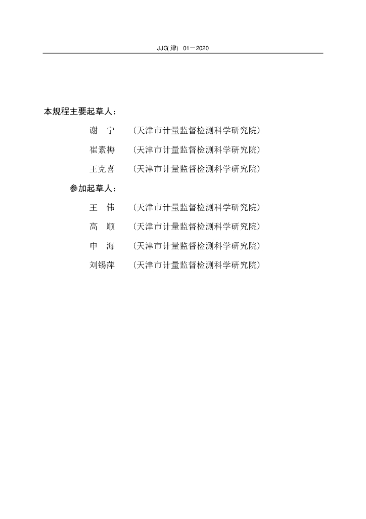 谢宁(天津市计量监督检测科学研究院)、崔素梅(天津市计量监督检测科学研究院)、王克喜(天津市计量监督检测科学研究院)、王伟(天津市计量监督检测科学研究院)、高顺(天津市计量监督检测科学研究院)、申海(天津市计量监督检测科学研究院)、刘锡萍(天津市计量监督检测科学研究院)