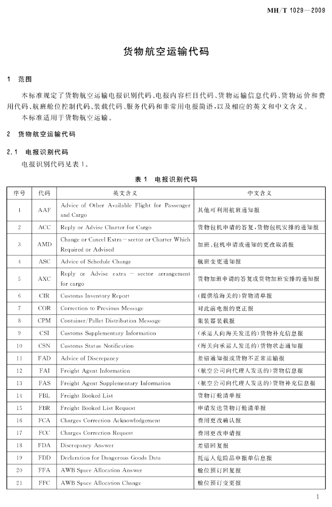 MH/T 1029-2009 货物航空运输代码