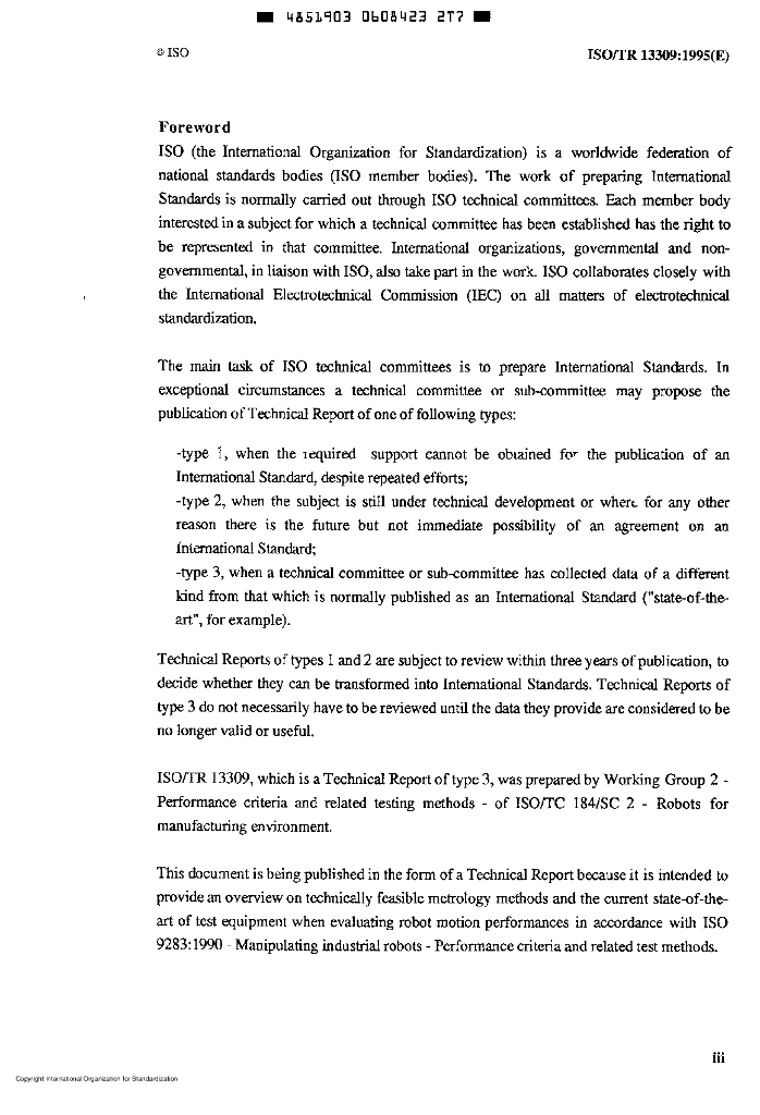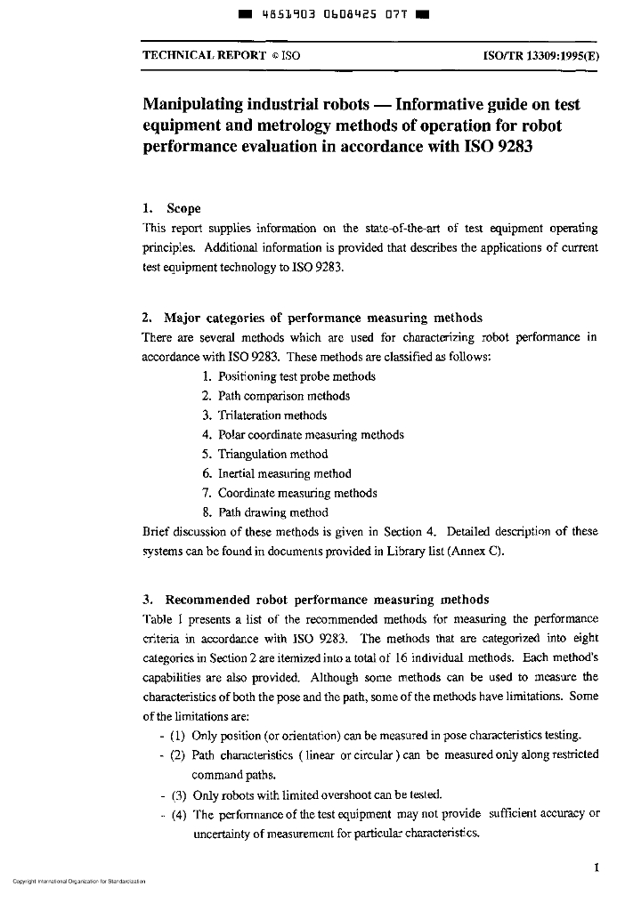 ISO/TR 13309-1995 操作型工业机器人 按照ISO 9283,对机器人进行性能评定的测试设备和操作计量方法的信息指南