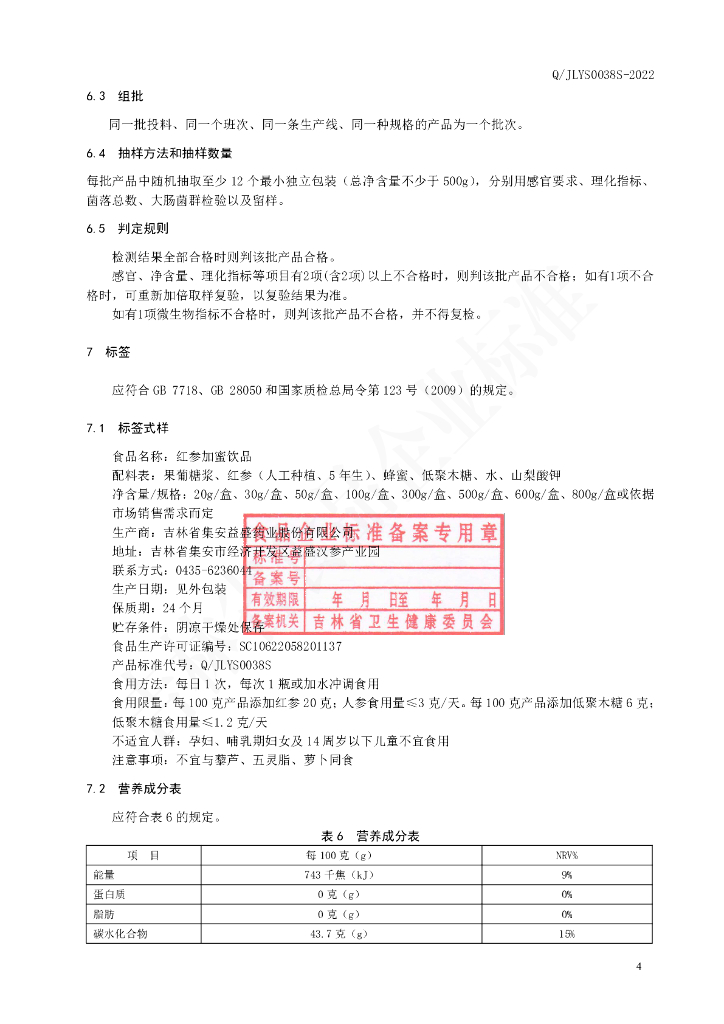 Q/JLYS 0038S-2022 红参加蜜饮品