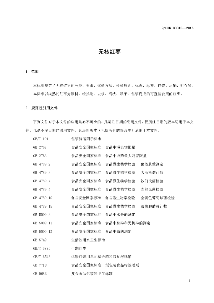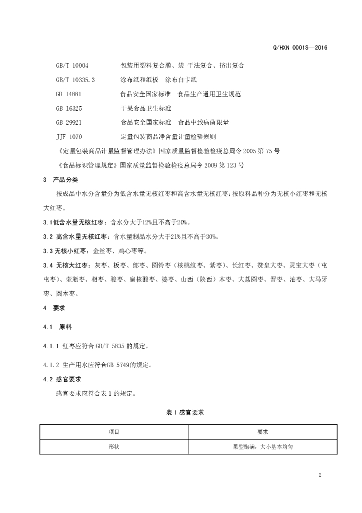Q/HXN 0001S-2016 好想你枣业股份有限公司 无核红枣