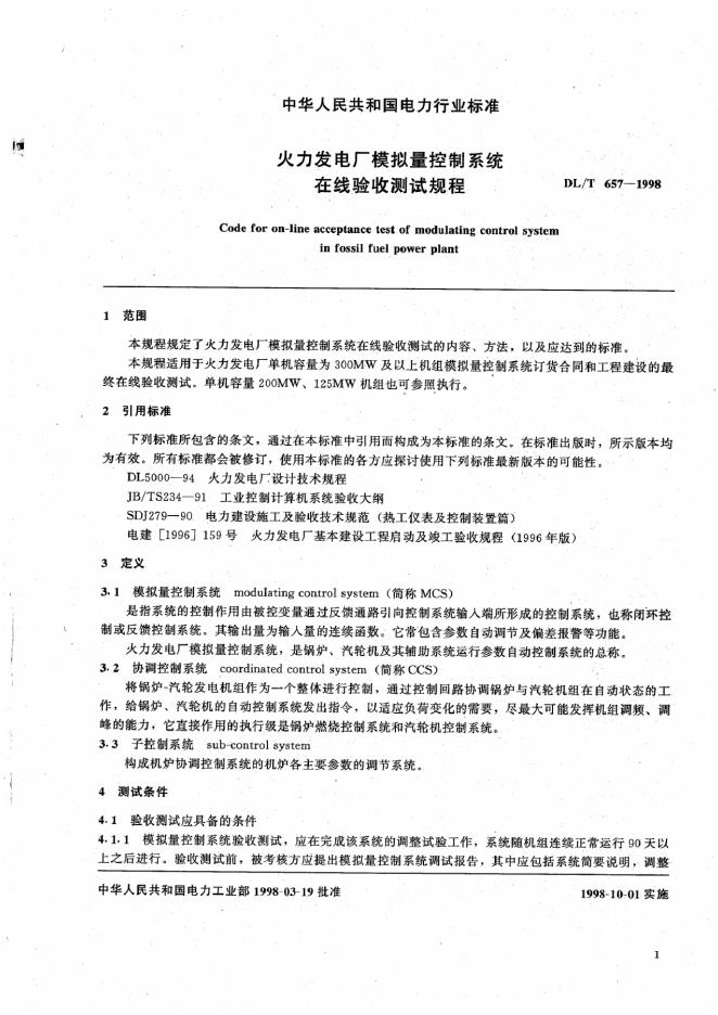 DL/T 657-1998 火力发电厂模拟量控制系统在线验收测试规程