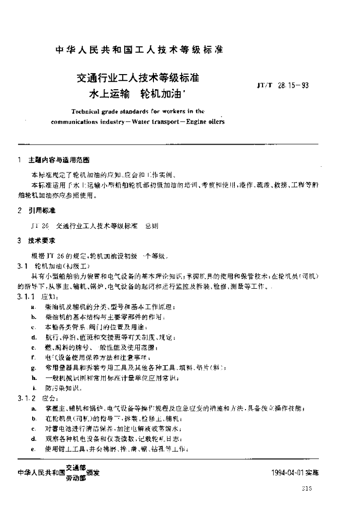 JT/T 28.15-1993 交通行业工人技术等级标准水上运输轮机加油