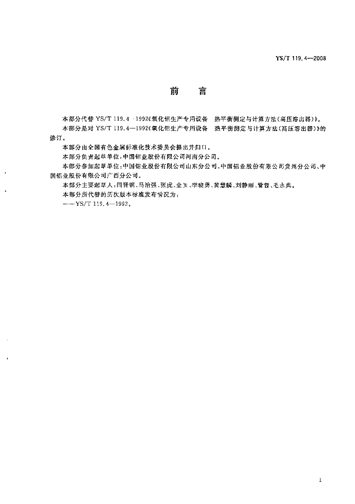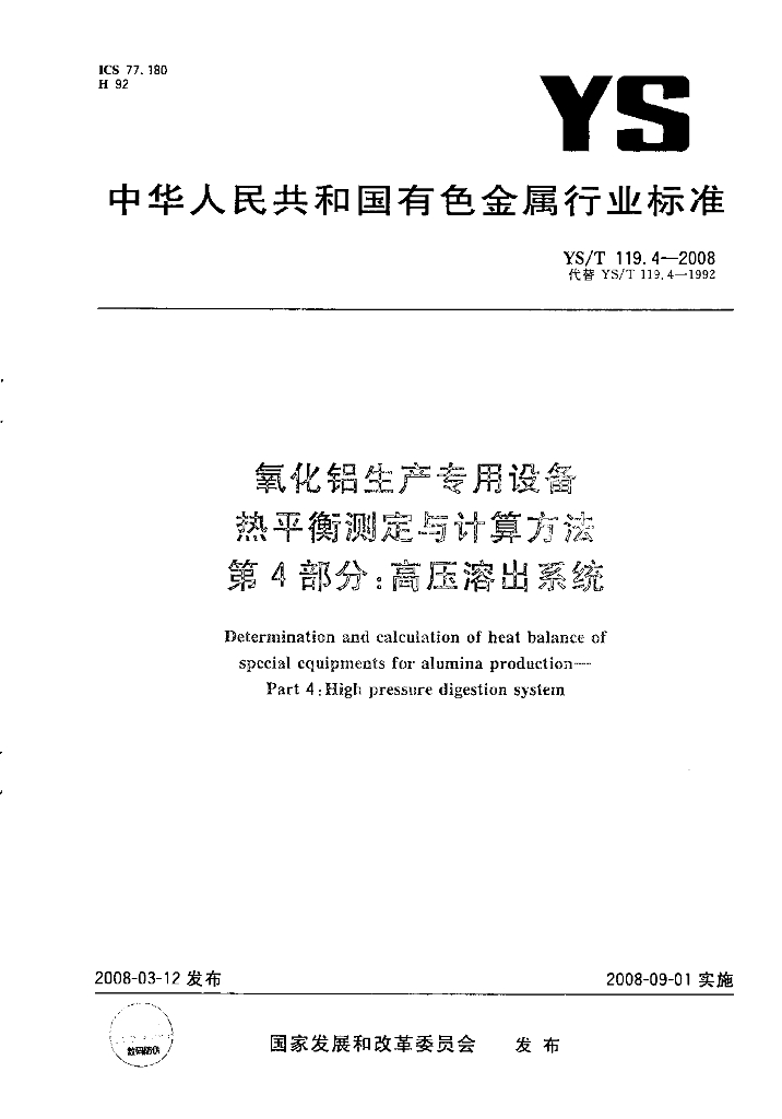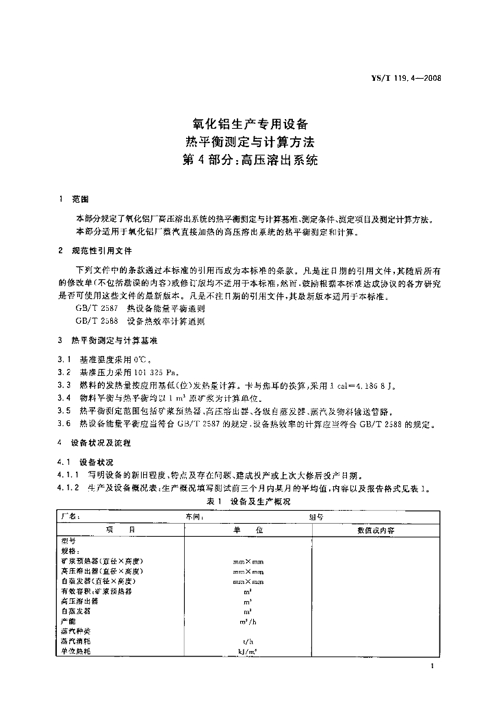 YS/T 119.4-2008 氧化铝生产专用设备热平衡测定与计算方法 第4部分 高压溶出系统