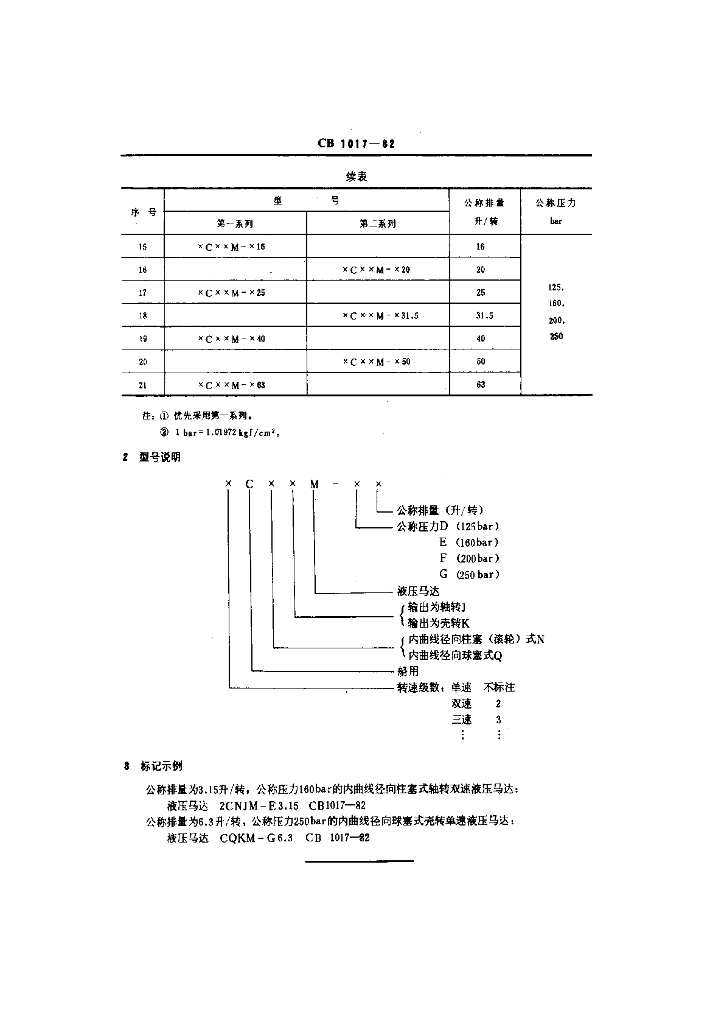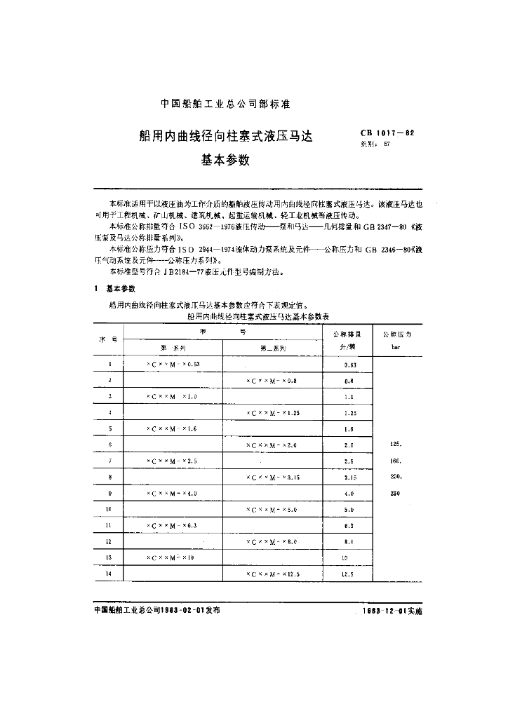 CB 1017-1982 船用内曲线径向柱塞式液压马达基本参数