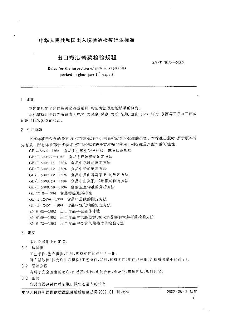 SN/T 1073-2002 出口瓶装酱菜检验规程
