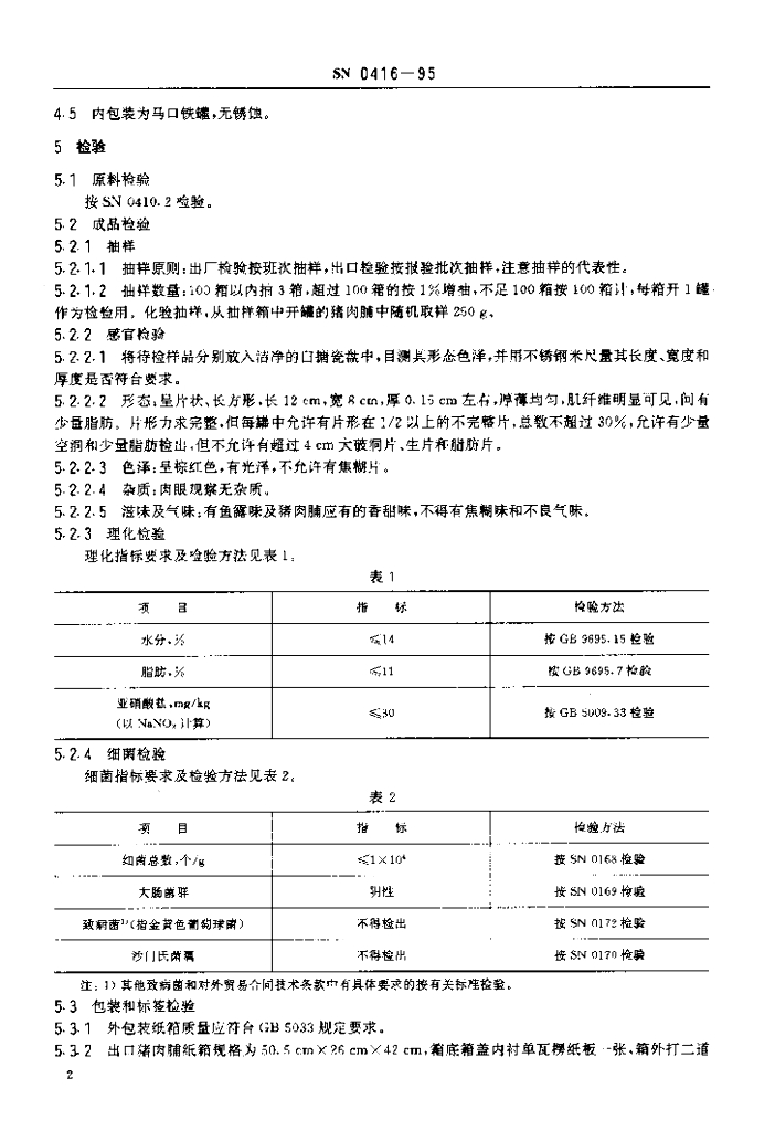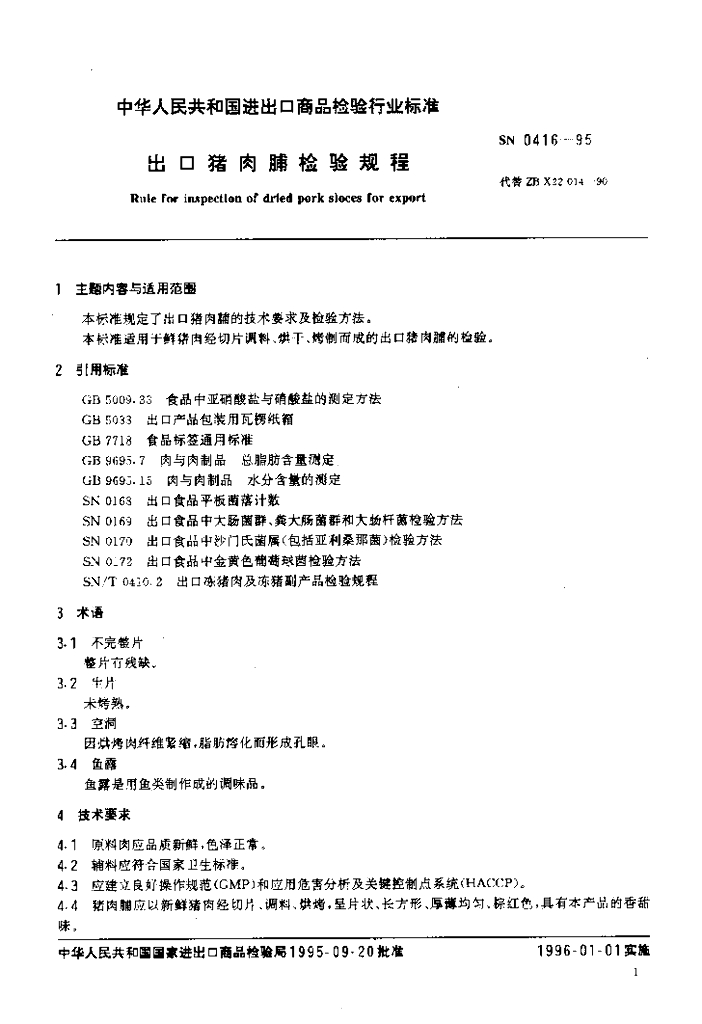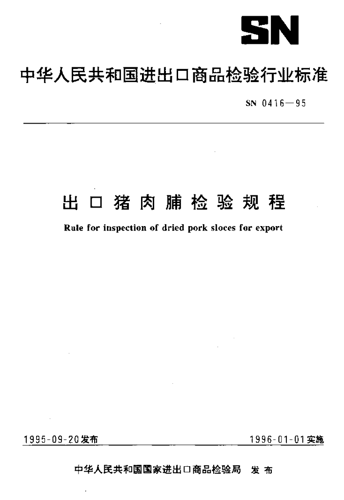 SN 0416-1995 出口猪肉脯检验规程