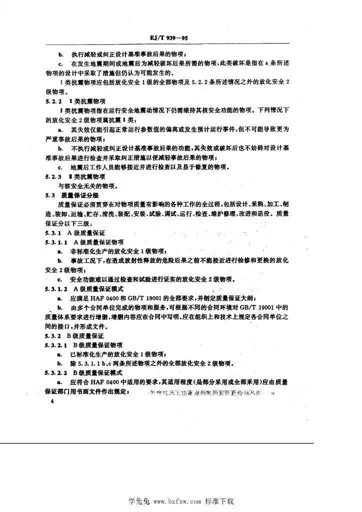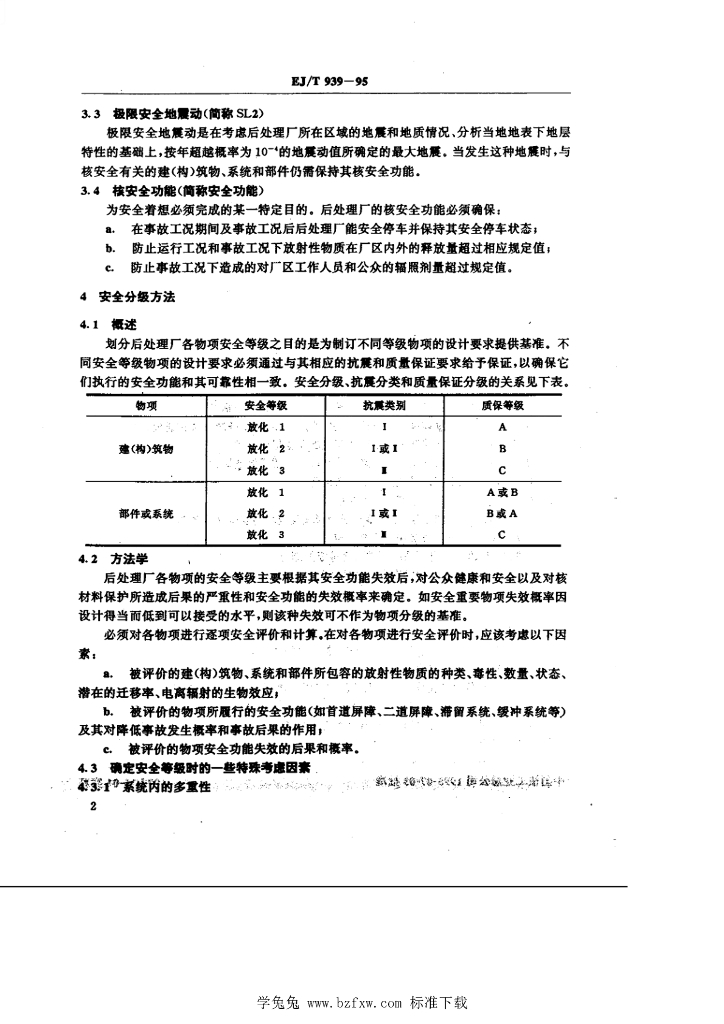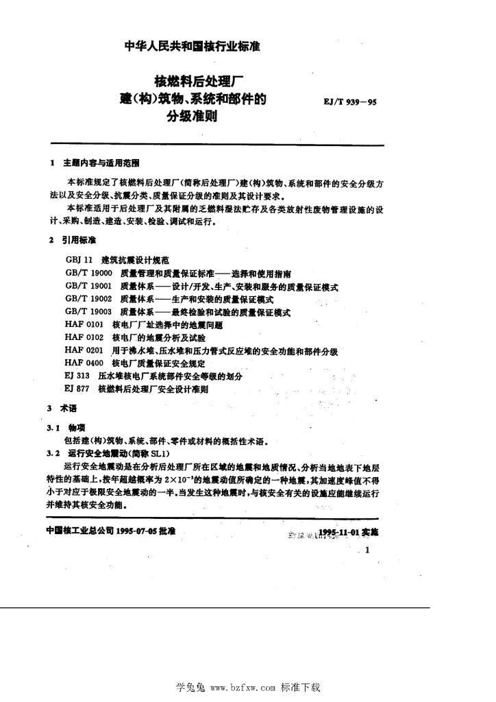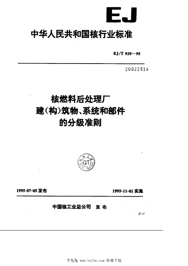 EJ/T 939-1995 核燃料后处理厂 建(构)筑物系统和部件 的分级准则