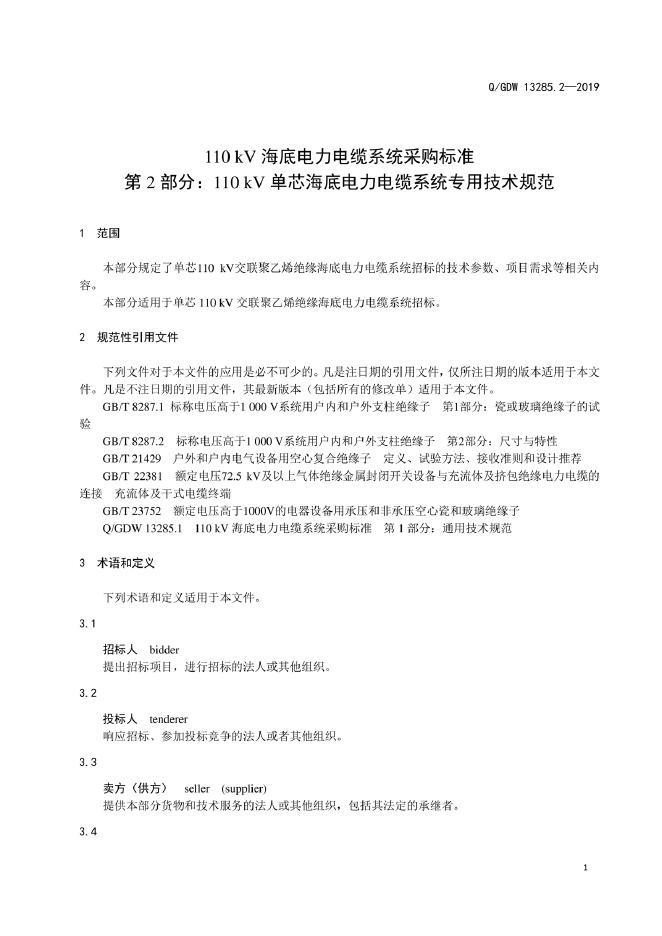 Q/GDW 13285.2-2019 110kV海底电力电缆系统采购标准 第2部分:110kV单芯海底电力电缆系统专用技术规范