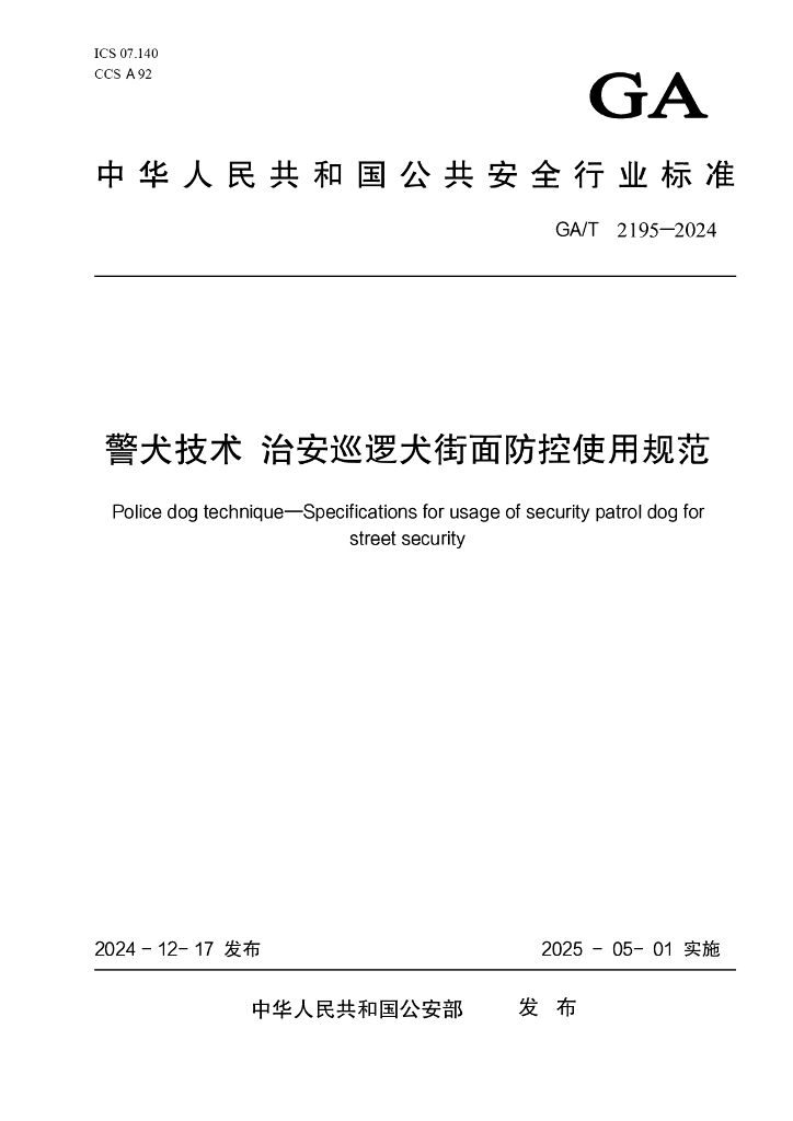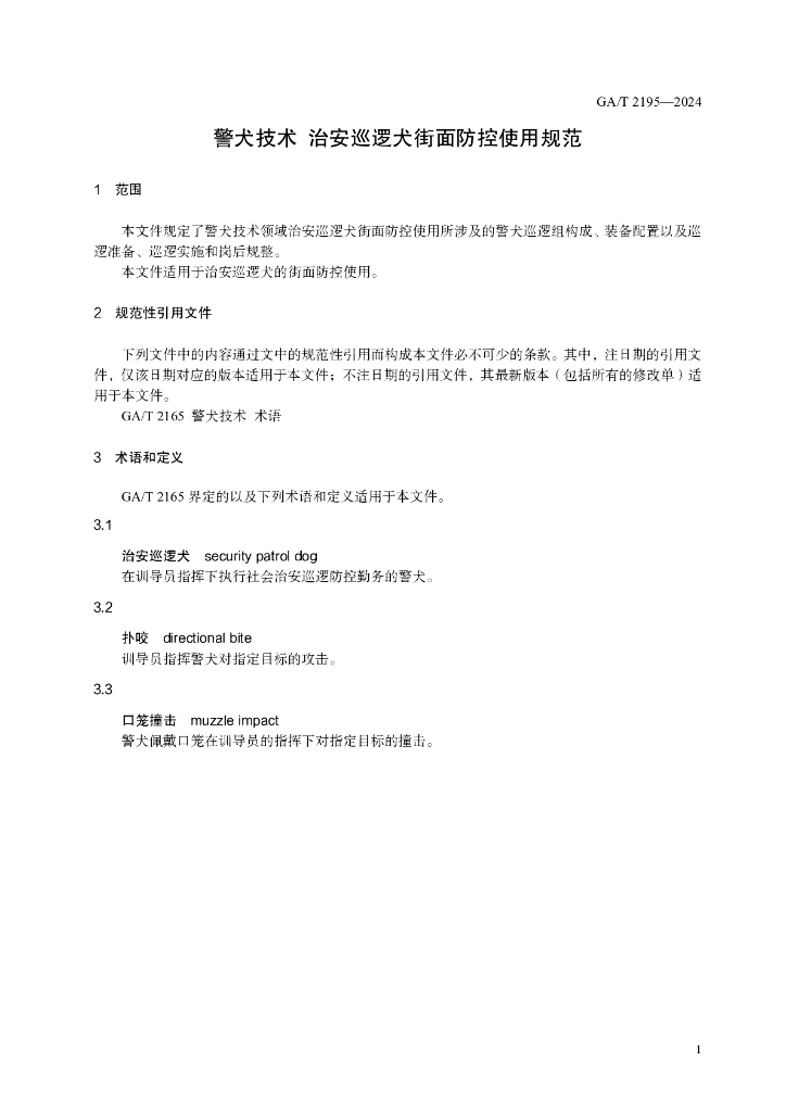 GA/T 2195-2024 警犬技术 治安巡逻犬街面防控使用规范