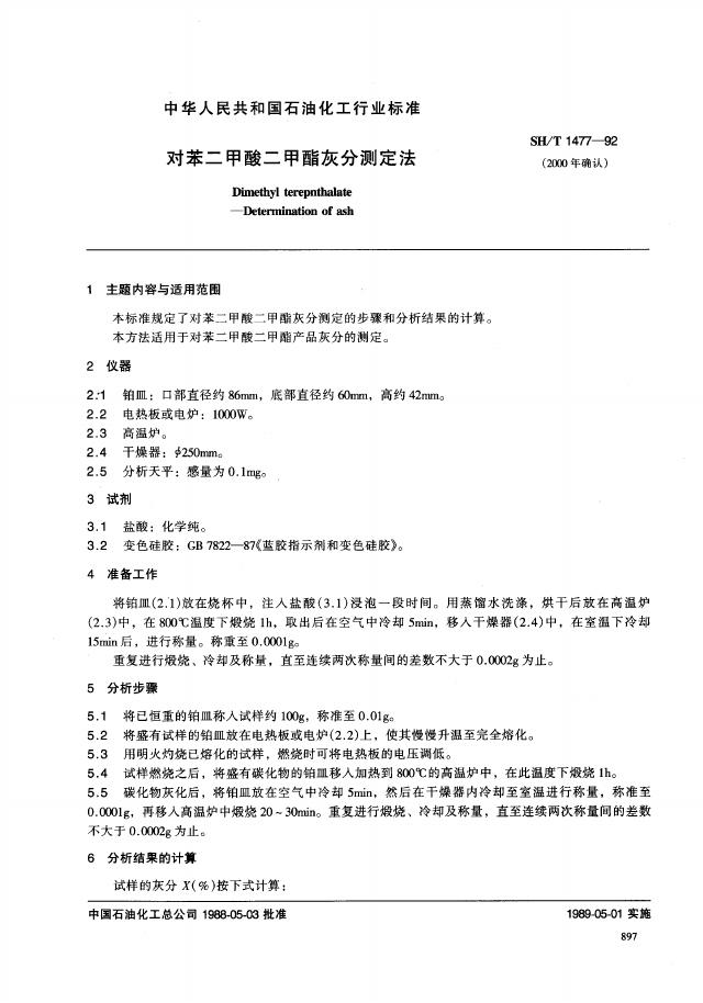 SH/T 1477-1992 对苯二甲酸二甲酯灰分测定法
