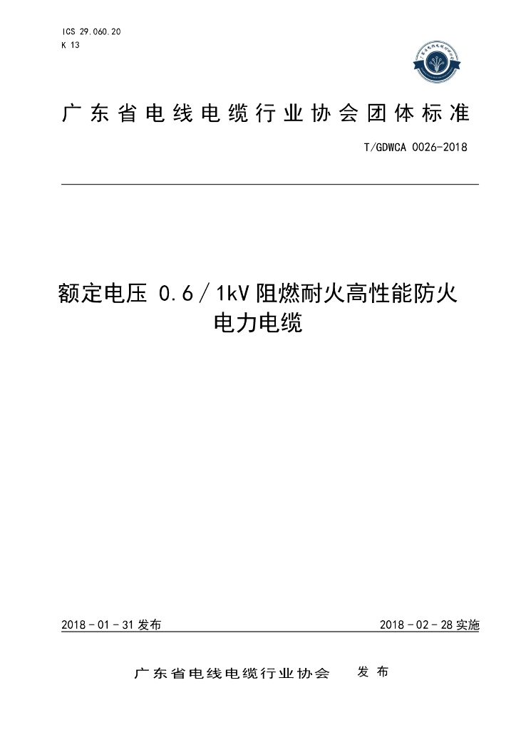 T/GDWCA 0026-2018 额定电压 0.6/1kV阻燃耐火高性能防火电力电缆