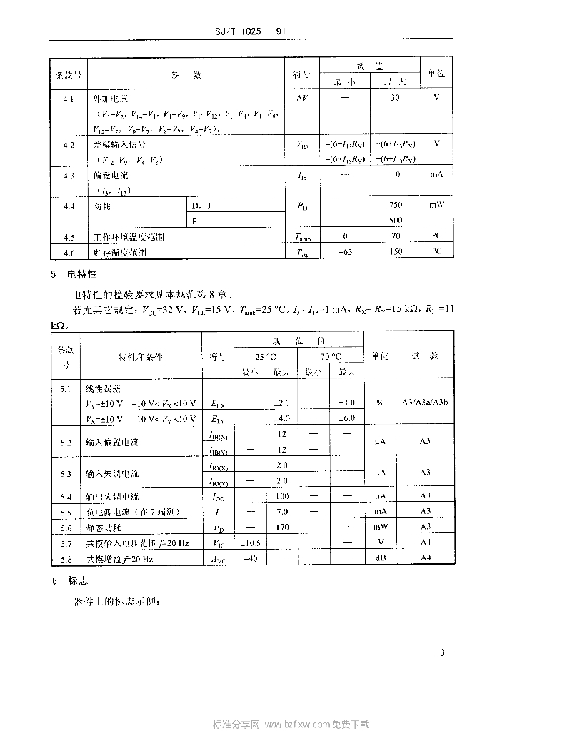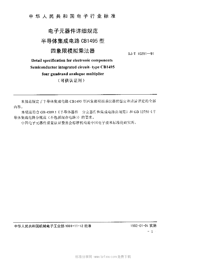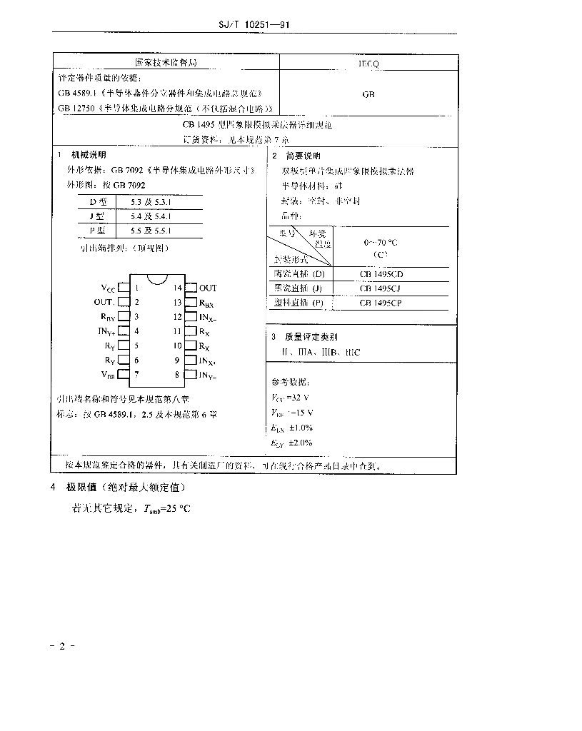 SJ/T 10251-1991 电子元器件详细规范半导体集成电路CB 1495型四象限模拟乘法器