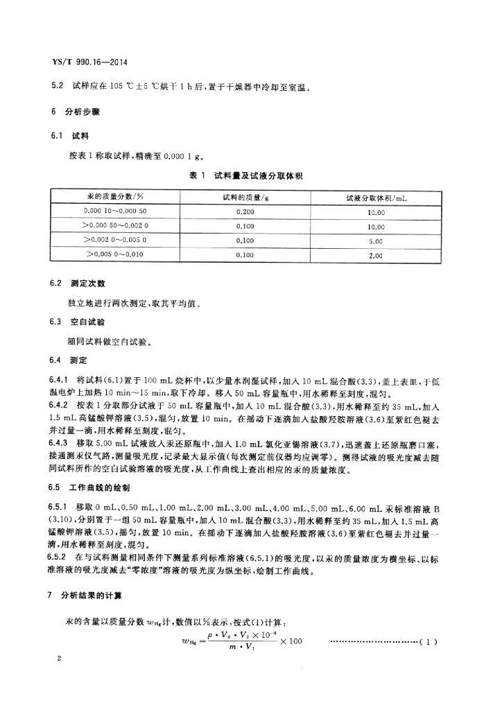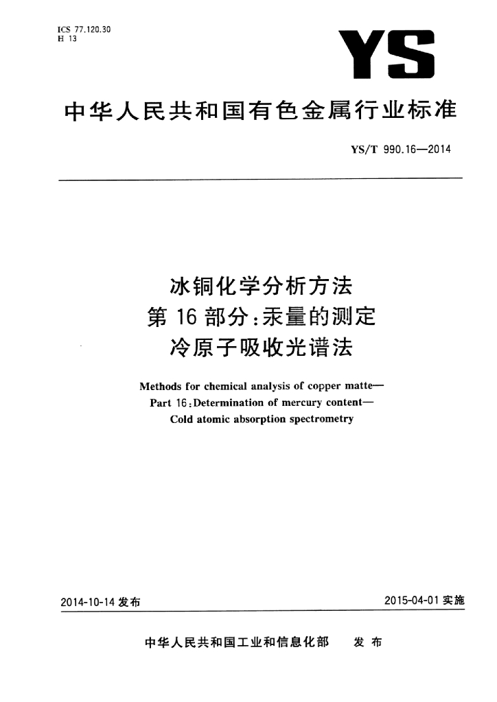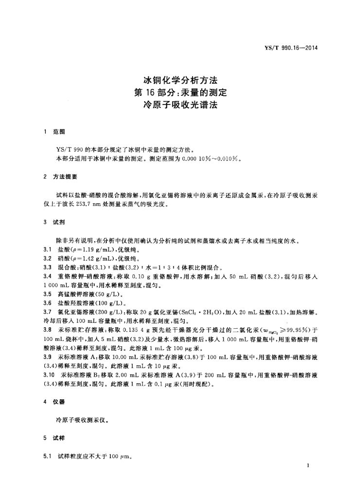 YS/T 990.16-2014 冰铜化学分析方法 第16部分:汞量的测定冷原子吸收光谱法