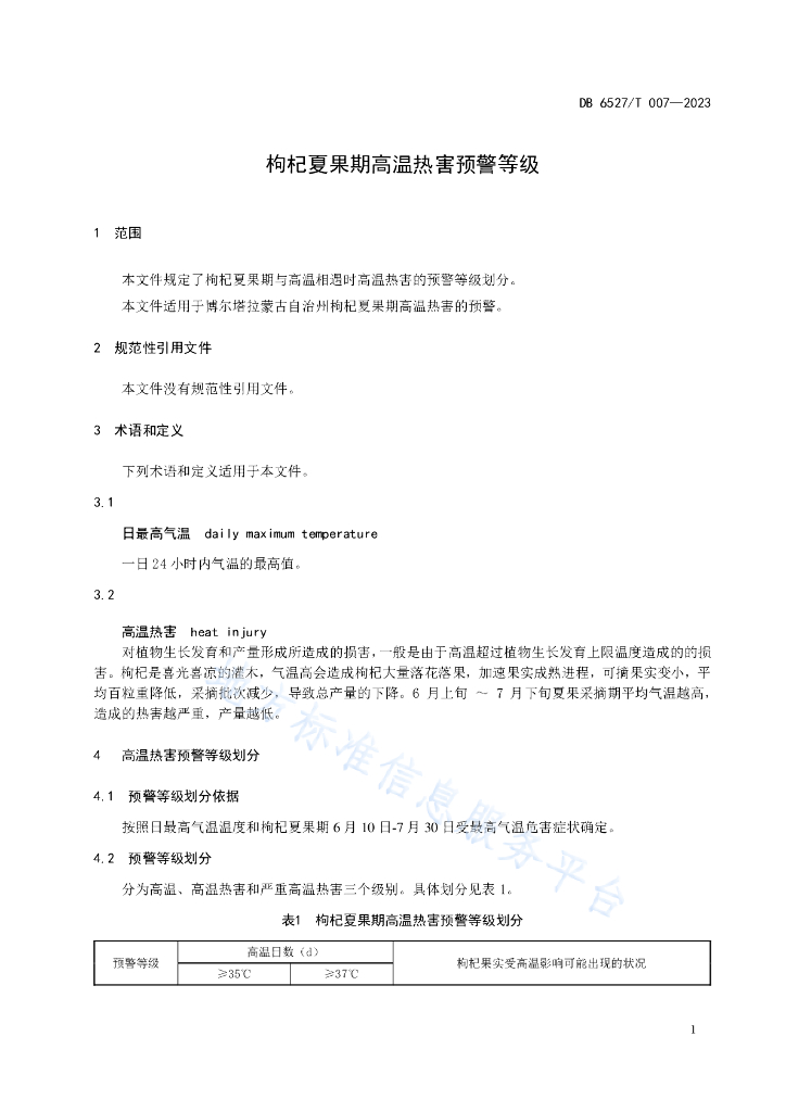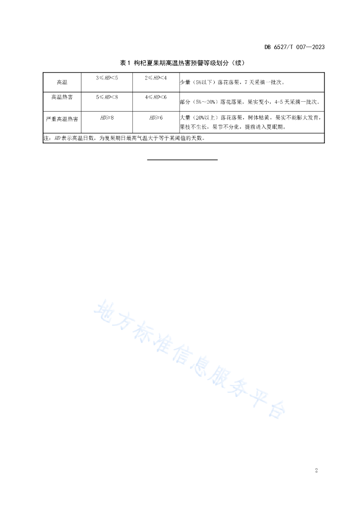 DB6527/T 007-2023 枸杞夏果期高温热害预警等级