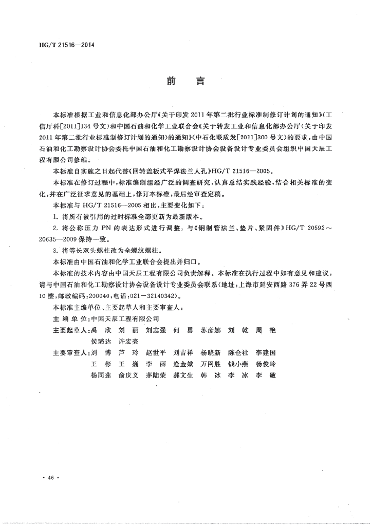 HG/T 21516-2014 代替 HG/T 21516-2005 回转盖板式平焊法兰人孔