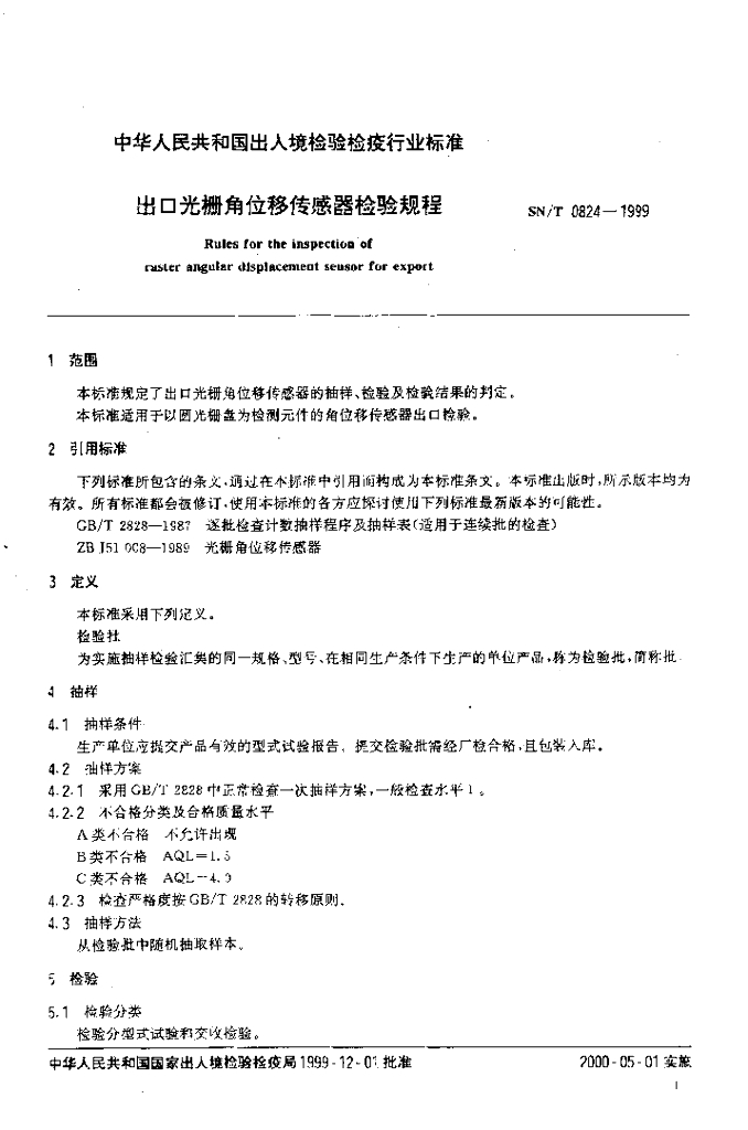 SN/T 0824-1999 出口光栅角位移传感器检验规程